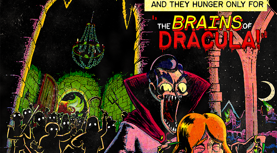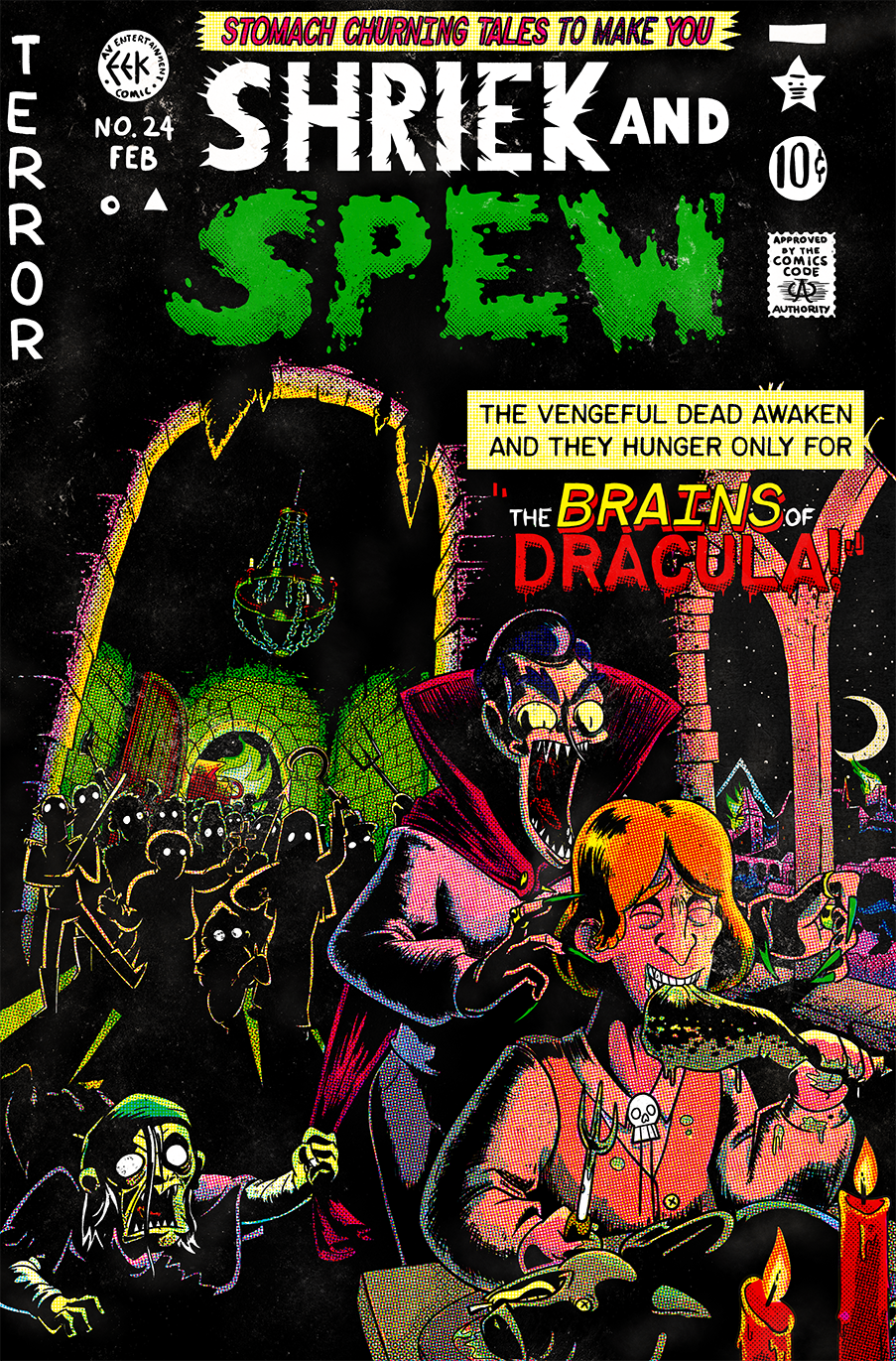 Hello, BOILs, GHOULS, and non-SPINEary pals! You’ve picked up the latest print of Shriek and Spew! the (fictional) comic magazine designed to spoil your young mind, and then… Your dinner! Ehhh heheheheheheee! Today’s story is about a wealthy man plagued by a horde of the undead. His name? Count Dracula! *thunder crash*”